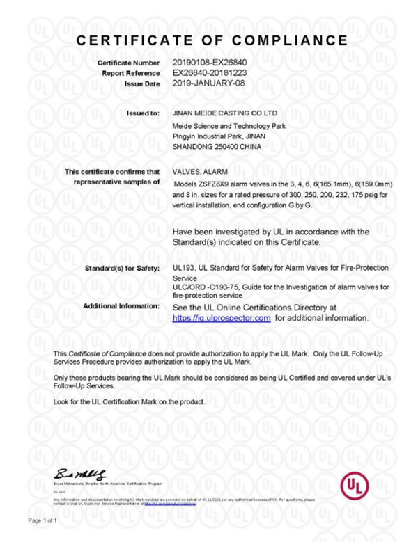 我司湿式报警阀型号ZSFZ8X9 通过UL认证