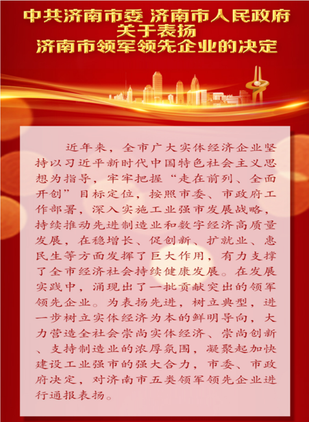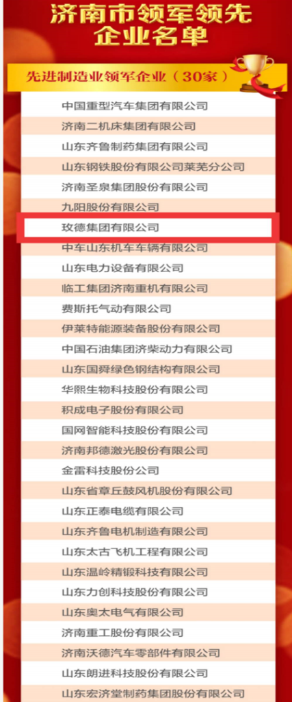 7月9号,中国共产党济南市委员会、济南市人民政府发布关于表扬济南市领军领先企业的决定的文件。玫德集团荣获先进制造业领军企业。