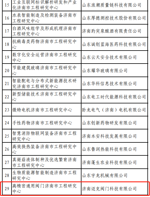 近日,济南市发展和改革委员会进行了2022年济南市工程研究中心拟认定名单的公示,济南迈克阀门科技有限公司认定为“高精密通用阀门济南市工程研究中心”。