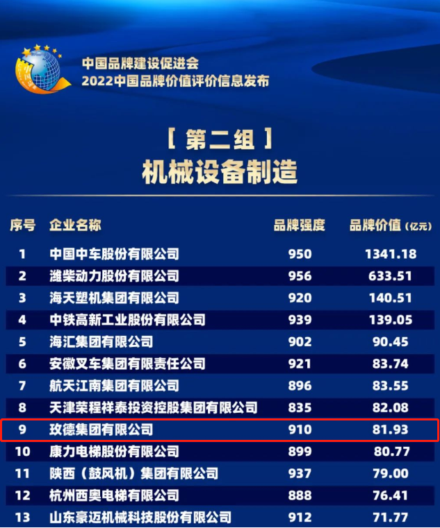 玫德集团在“机械设备制造组”荣获第九名,品牌强度910,品牌价值81.93亿元,品牌强度相较2021年的887增长了23,品牌价值由2021年的73.16亿元,增长了8.77亿元。