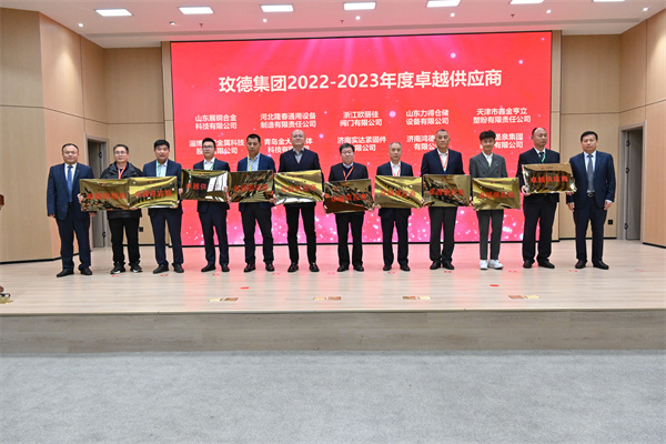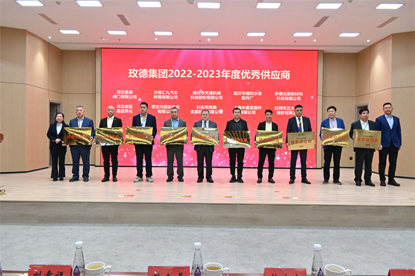 供应商颁奖环节,由玫德集团董事局主席孔令磊、玫德庚辰金属材料有限公司总裁于瑞水、济南迈克阀门科技有限公司总裁赵桂芝、济南科德智能科技有限公司总裁刘少云、玫德雅昌(济南)管业有限公司总裁田洪莲、山东晨晖电子科技有限公司总裁曲延河为玫德集团“卓越供应商”以及“优秀供应商”颁奖,夯实了供应商与玫德集团的合作,促使玫德集团提供更加优质的产品、解决方案以及服务。