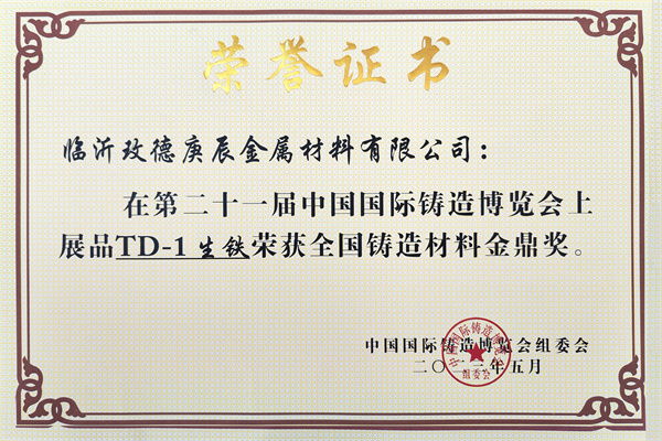 临沂玫德庚辰金属材料有限公司展品“TD-1生铁”荣获全国铸造材料金鼎奖。