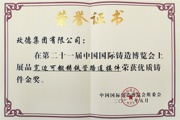 时博官网登录入口展品“宽边可锻铸铁管路连接件”荣获优质铸件金奖。