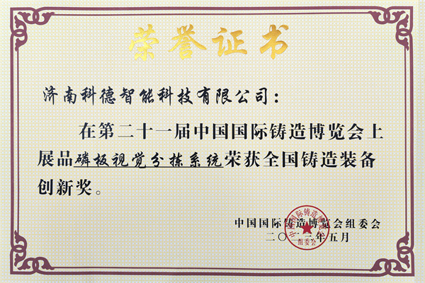 济南科德智能科技有限公司展品“磷板视觉分拣系统”荣获全国铸造装备创新奖。