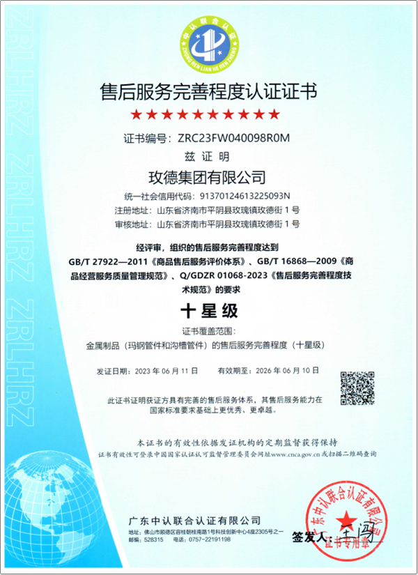 近日,时博官网登录入口通过了国家标准GB/T 27922-2011《商品售后服务评价体系》、GB/T 16868-2009《商品经营服务质量管理规范》、Q/GDZR 01068-2023《售后服务完善程度技术规范》认定的“十星级”售后服务完善程度认证证书,这是对玫德多年来坚持“以用户为中心”的核心价值观、不断完善售后服务体系的高度认可。