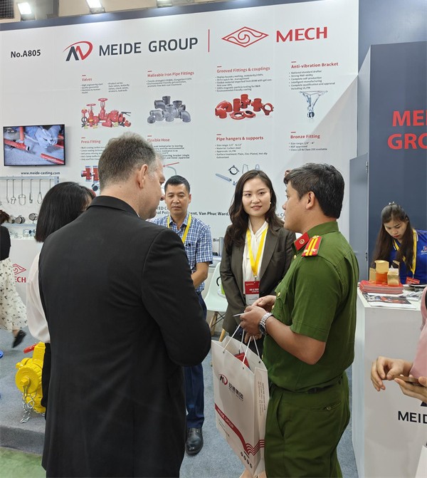 玫德集团在A馆A805展位为客户展出了众多消防产品,包括碳钢齿环卡压管件、碳钢卡压管件、消防金属软管、玛钢管件、沟槽管件、阀门、水表、灌浆套筒、不锈钢管材管件、支吊架,抗震支架等产品,为全球用户提供消防领域一站式产品。