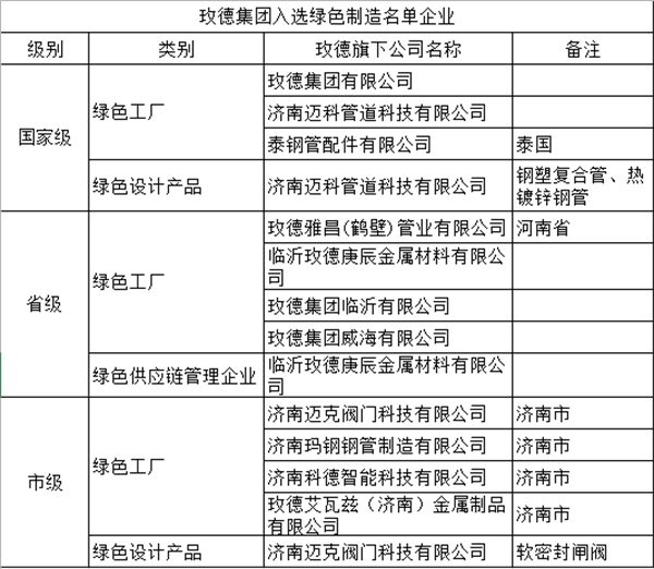 7月28日,山东省工业和信息化厅公布了2023年(第一批)省级绿色制造名单。玫德集团3家企业入选,其中玫德集团威海有限公司、玫德集团临沂有限公司被评为为山东省绿色工厂,临沂玫德庚辰金属材料有限公司被评为山东省绿色供应链管理企业。