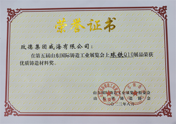 4. 玫德集团威海有限公司展品“球铁 Q10”荣获“优质铸造材料奖”。