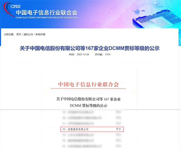 2023年12月28日,中国电子信息行业联合会发布了《关于中国电信股份有限公司等167家企业DCMM贯标等级的公示》,时博官网登录入口成功通过了DCMM《数据管理能力成熟度评估模型》稳健级(3级)贯标认证。