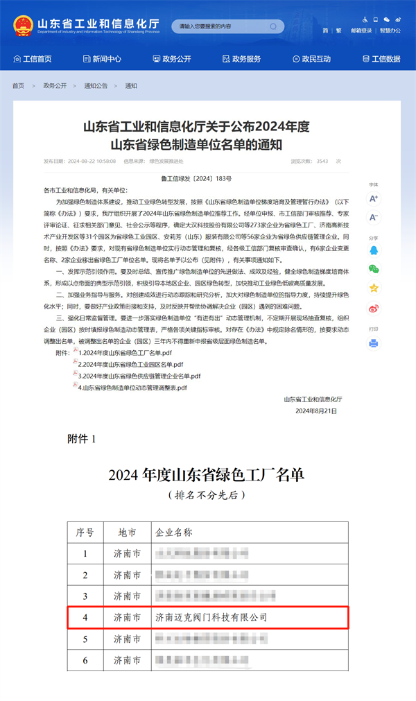 2024年8月22日,山东省工业和信息化厅发布《关于公布2024年度山东省绿色制造单位名单的通知》,经单位申报、市工信部门审核推荐、专家评审论证、征求相关部门意见、社会公示等程序,玫德集团旗下济南迈克阀门科技有限公司顺利通过审核,荣获“山东省绿色工厂”。