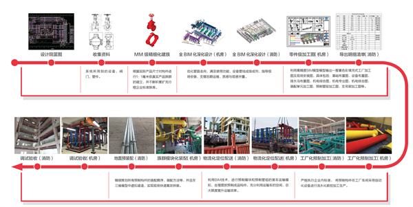 根据传统消防安装行业痛点问题,依托集团消防领域一站式产品,根据项目要求出具定制化解决方案,通过BIM技术、工厂化预制加工、数字化安装、智能运维等技术,实现消防安装数字化,消防运行智能化。