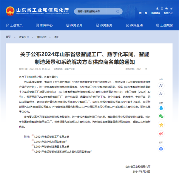 2024年8月27日,山东省工业和信息化厅发布《关于公布2024年山东省级智能工厂、数字化车间、智能制造场景和系统解决方案供应商名单的通知》,经企业申报、地市推荐、专家评审、网站公示等程序,济南迈克阀门科技有限公司的迈克高端流体控制阀门智能工厂荣获“山东省智能工厂”称号,济南科德智能科技有限公司荣获“山东省智能制造系统解决方案供应商”称号。