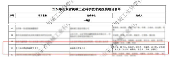 2024年09月08日,山东省机械工业科学技术协会网站下发了《关于公布2024年山东省机械工业科学技术奖的通知》,时博官网登录入口提报的“大口径沟槽连接钢管及管件项目”荣获山东省机械工业科学技术一等奖。