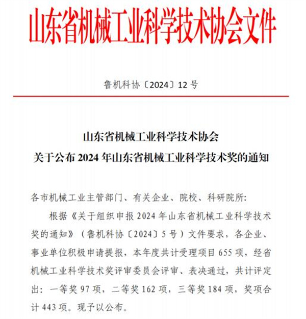 山东省机械工业科学技术奖是省部级科研成果奖,是由山东省机械工业科学技术协会设立的,每年评选一次,旨在选出成果技术创新性突出、技术经济指标先进、具备显著应用推广效益,在推动机械工业科学技术进步等方面有重大贡献的科技项目,具有较高的含金量。