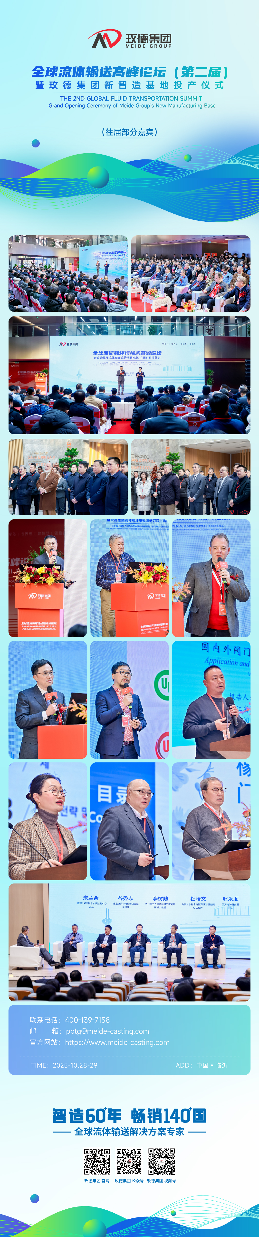 全球流体输送高峰论坛(第二届)暨玫德集团新智造基地投产仪式将于2025年10月28日至29日在山东临沂隆重召开!本届论坛将邀请全球顶尖专家及学术骨干等300余人,汇聚行业智慧,共探前沿技术。论坛将聚焦市政、建筑、工业与电力等领域,围绕行业政策、发展动态与未来展望开展深度研讨,共同探讨行业发展的新机遇与新挑战。