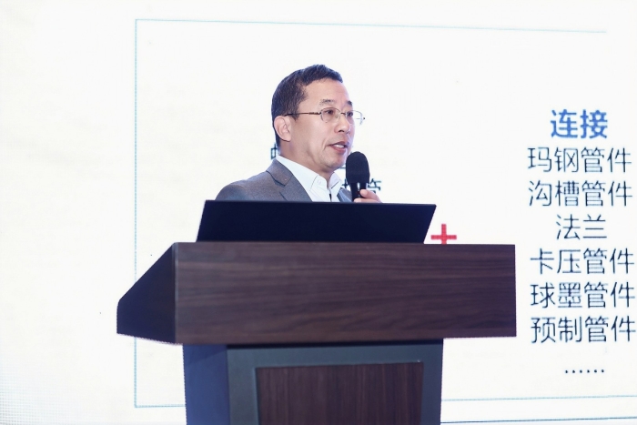 玫德集团市政BG水利BU球墨管材管件研发部经理孙允月发表《球墨铸铁管助力现代管道系统建设》主题演讲,紧扣城镇水务发展核心需求,剖析了球墨铸铁管在行业中的应用价值与发展趋势,重点介绍了玫德集团的产品优势、玫德铸管的核心优势:产品覆盖标准全、规格全、壁厚等级全、接口连接方式全,产品实现DN80-DN2600全规格覆盖,配套多系列管件可按需定制,适配市政供水、水利工程、排水防洪等多场景;依托高纯铁水生产、“一罐到底”短流程等领先工艺,以及全自动化智造产线,铸就产品硬核品质;同时打造“产品+解决方案”一站式服务,覆盖智慧水务管理、管道安全监测等全产业链,搭配全球化高效服务网络,为管道系统建设提供全生命周期保障。